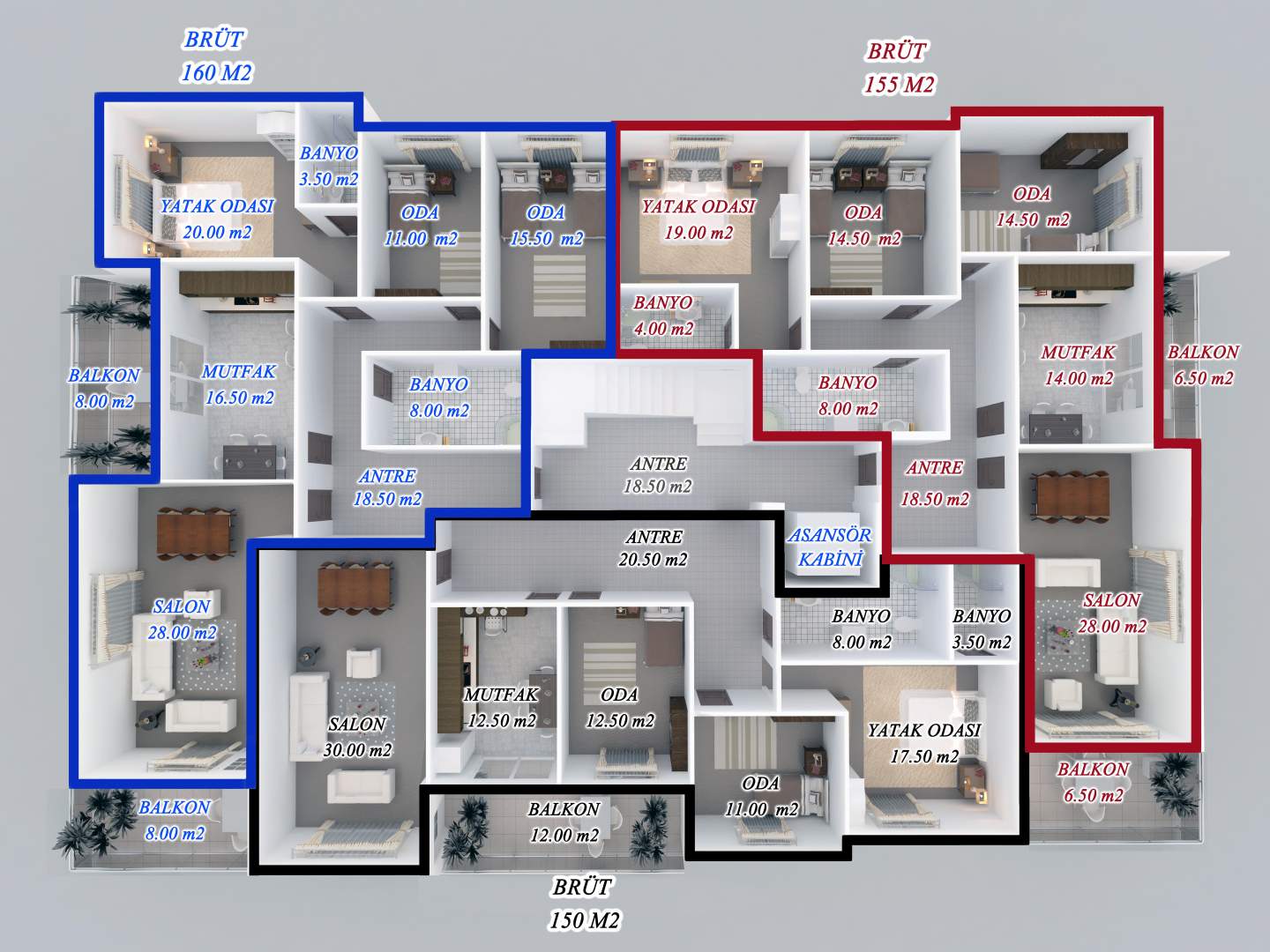 - 3+1 daireler (160-150-155) m2'lik daireler.