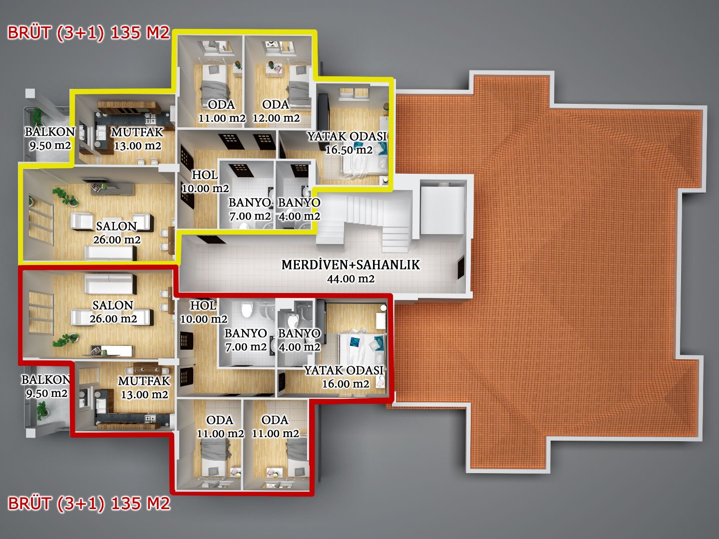 - 3+1 daireler 135 m2'lik Daireler (10 Adet)
