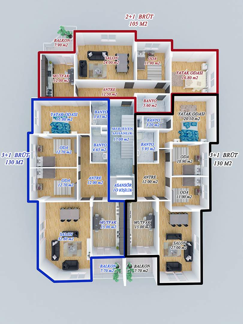 - 3+1, (130) m2'lik daireler.